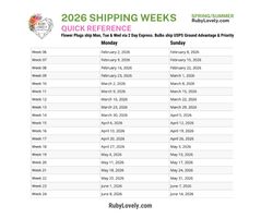 Plug sales are hosted every week on Sundays at 3PM EST. If a special holiday falls on a Sunday, the sale is moved to Thursday at 7PM EST. or another day of our choosing. Sales are labeled by Shipping Week which is the week the order will be shipped. See below 2026 shipping weeks and schedule for some upcoming sales. For the Spring/Summer season, we have sales until June. Then we take a break, and resume for the Fall Season around the end of August through to November. To order, add the desired items to your cart, and agree to our terms and conditions in order to check out. We invite you to read our terms in advance. There is NO MINIMUM ORDER. PRE-ORDER SALES The customer orders up to 4 weeks in advance before the order will be shipped. REGULAR SALES Orders start shipping from the 1st Monday after the sale. SHIPPING AND HANDLING Plugs ship 2 Day Express on the Monday, Tuesday, Wednesday & Thursday of the Sale Shipping Week. PEAK SHIPPING SCHEDULE FOR PLUGS - Tuesday to Thursday and Monday the following week. 1-3 items $14.50, 4-6 items $17.50, 7-9 $23.50, 10-12 $32, 13 & Up $40. 1 item = 1 quantity of a product. If a product listing is for 20 plugs, that's 1 item. For example, if the customer increases the quantity to 2 (40 plugs total), then that's 2 items. There is a Handling Fee of $3 for every order. Follow us on Facebook at RubyLovelyShop & Join our Facebook Groups: Cut Flower Plugs and Bulbs Small Quantities and Specialty Cut Flower Plugs/Smallscale